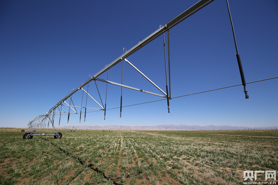 合作社配套的种植基地中,大型浇灌机正在工作。种植基地在生产过程中,将5000亩沙漠改良成为了可耕种土地,兼顾了农业生产和防风固沙。