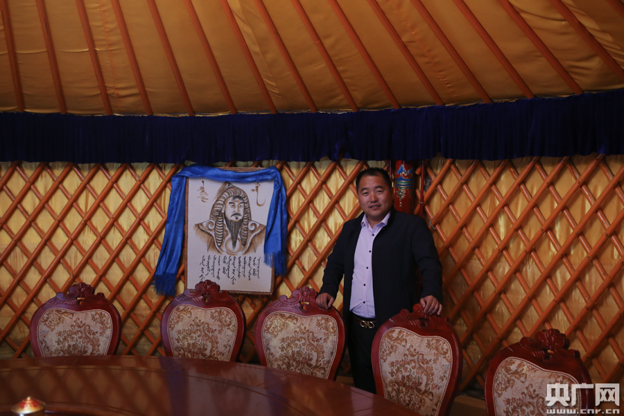 2006年,亿利资源集团在库布其沙漠七星湖地区建造了牧民新村,大刀图柴登整体生态移民,牧民们搬到了牧民新村。孟克达来是其中一位,来到牧民新村之后,他和妻子干起了餐饮和牧家乐来接待沙漠游客。在旺季,一天可以接待200人。收入逐年增长,2016年他家的收入就达到30万元。图为孟克达来在自家牧家乐的蒙古包内。