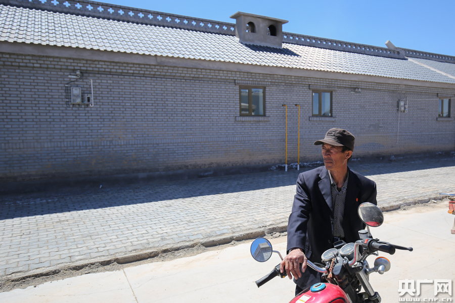 杭锦淖尔亿利新村,一名居民和他的摩托车。可以看到新村的砖瓦房整齐大气,街道也非常整洁。