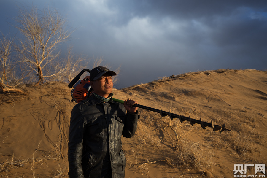 在库布其沙漠,让森林重现,在亿利资源集团的努力下,已经逐渐成为了可能。往昔,每日都要刮六、七十次沙尘暴,而如今沙尘暴几乎绝迹。走在库布其的路上,迎面而来的是清风和阳光。图为一名植树工人走在回家的路上。