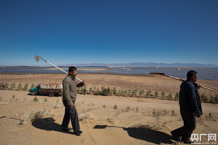 距鄂尔多斯市杭锦旗120余公里,库布其沙漠腹地,亿利集团库布其生态光能产业基地建设在一处平整的沙地上:一排排光伏板整齐有序地排列着,3米高的支架下,不停跑动的地蹼,板下、板间种植优良甘草、牧草及地被植物。