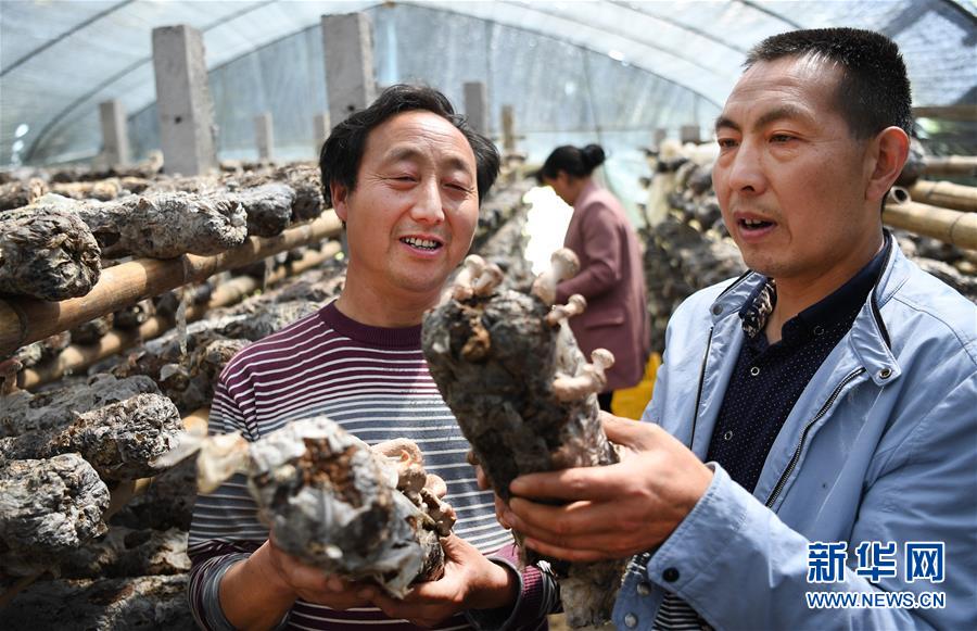 5月23日,汉水源村村委会主任赵小波(右)在食用菌大户赵彦平的生产基地了解食用菌销售情况。位于长江支流汉江发源地的陕西省宁强县汉源街道办汉水源村,自2013年开始利用生态优势,走出一条以发展生态食品生产和生态旅游的脱贫之路。这个村建有茶叶、银杏园区780多亩,养殖大鲵5000余尾、土蜂300余箱,种植中药材80多亩,发展食用菌12万余袋,产业扶贫初具规模。2016年,全村538户2009人靠生态种植和养殖,人均年收入达5260元。新华社记者陶明 摄