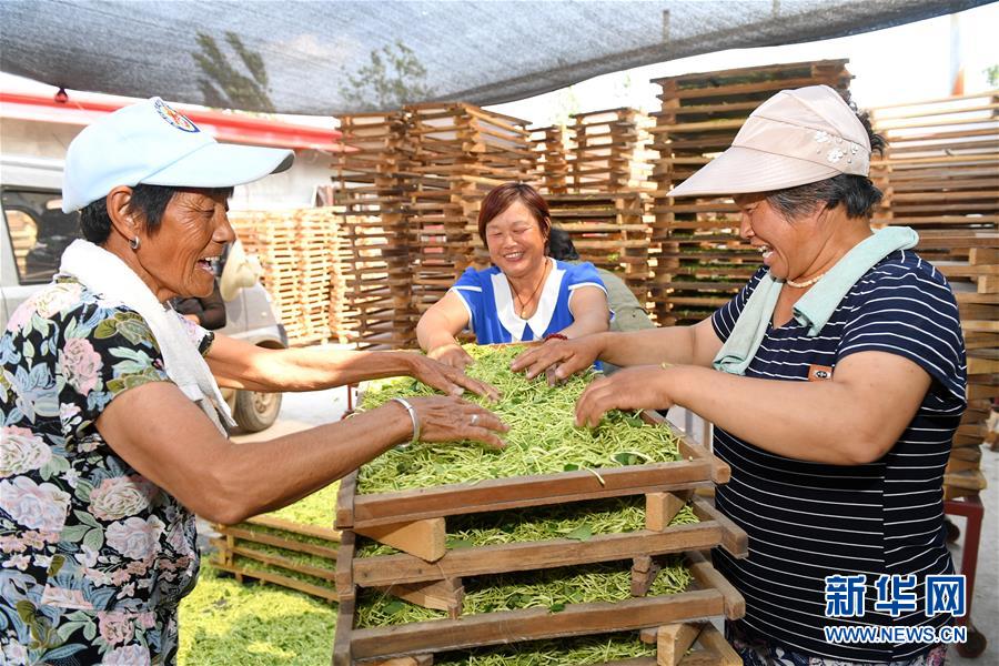 6月8日,河北省巨鹿县小吕寨镇西孟庄村农民将刚刚采摘的金银花装盘以备烘干。近年来,河北省巨鹿县依托当地悠久的金银花种植历史,把金银花产业作为脱贫攻坚的重要手段。目前,巨鹿县金银花种植面积达13万亩,年产值12亿元,涉及4万多农户,金银花产业已成为当地农民脱贫增收的重要途径。新华社记者牟宇 摄