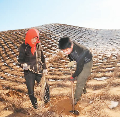 白芨滩林场职工在扎草方格