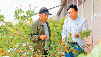 蔡有鹏(右)和贫困户工人查看大棚观光农业种植情况。