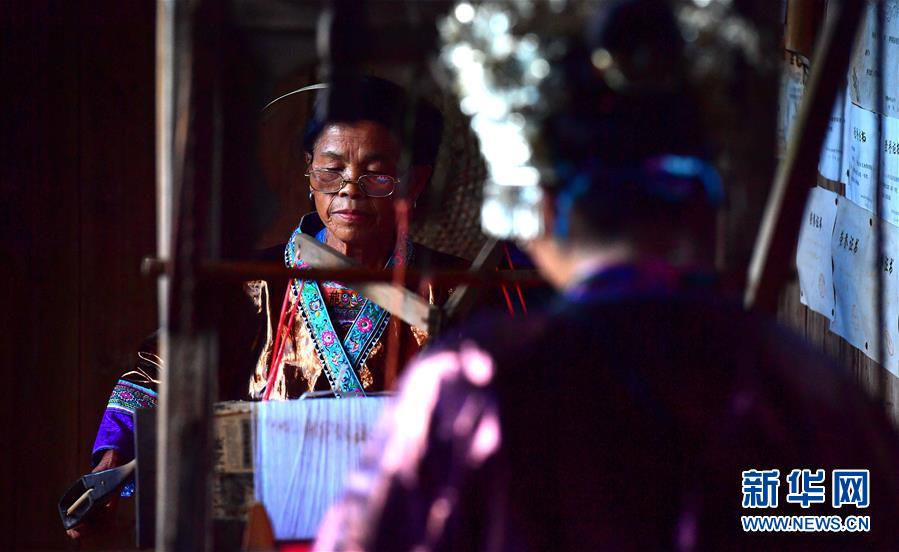6月14日,在融水苗族自治县香粉乡古都村,两名苗族绣娘在自家屋内的织布机上制作苗族织锦。 新华社记者 黄孝邦 摄