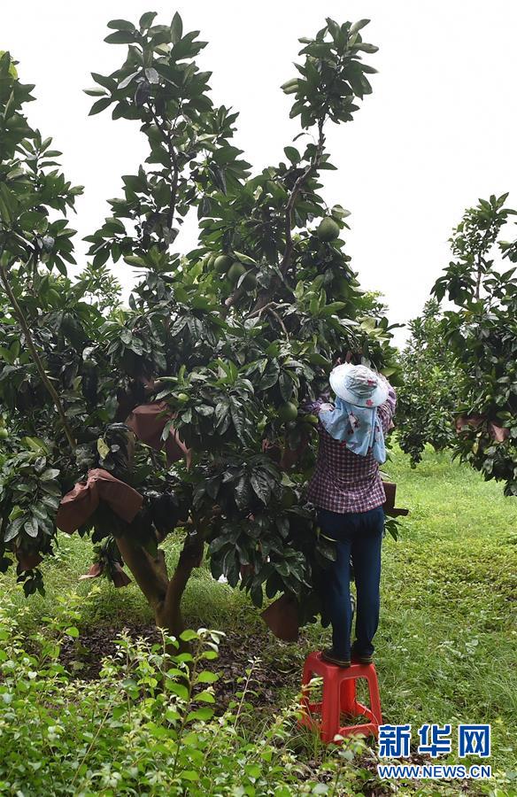 广东梅州市雁洋镇当地村民在柚子园内劳作(6月13日摄)。