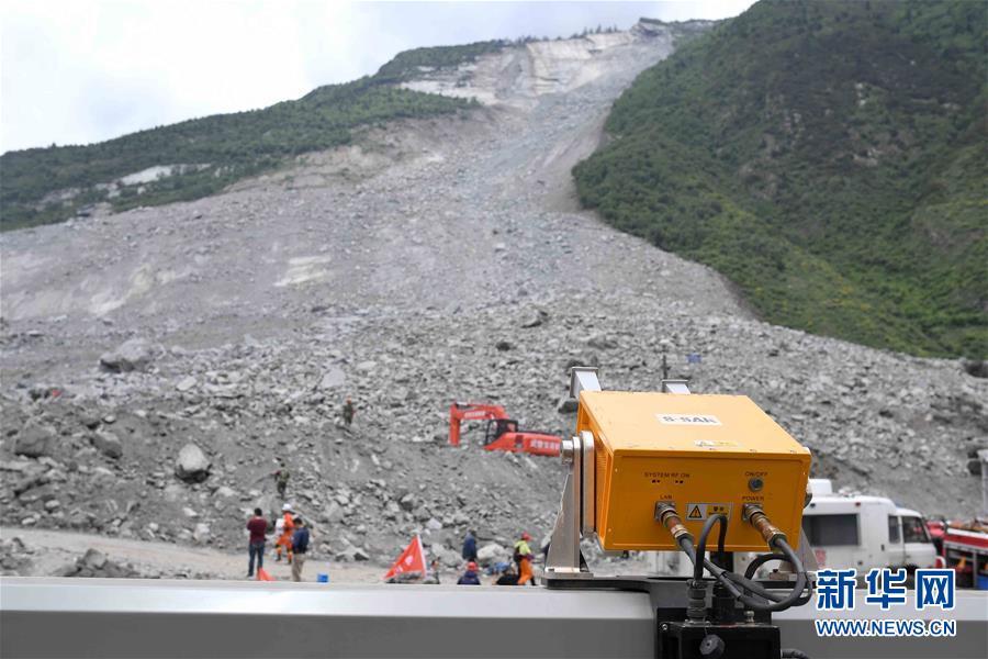 6月25日,能监测山体滑坡的边坡雷达在茂县山体垮塌现场监测滑坡体的变形情况。