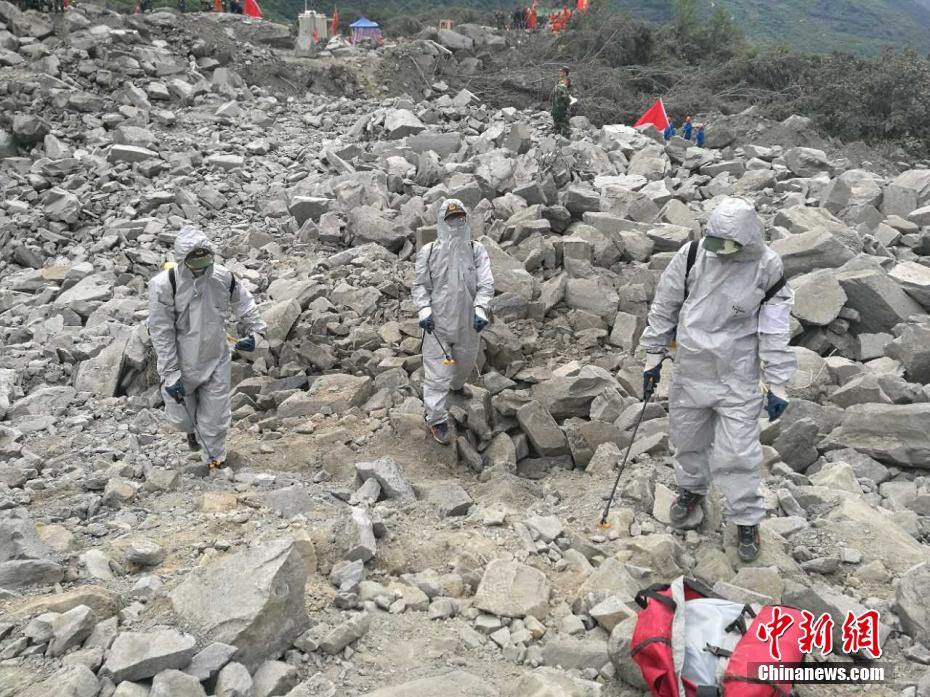 工作人员对茂县垮塌现场和官兵驻点进行消毒防疫工作