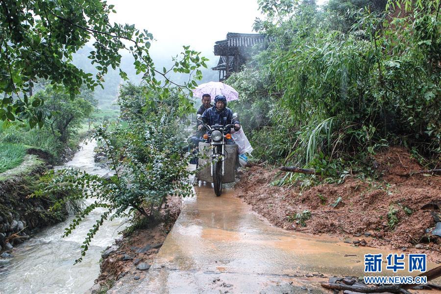 6月26日,在湖南省邵阳市绥宁县长铺子苗族侗族乡芷坪村,村秘书李林(前)驾驶摩托车为受灾村民运送物资。