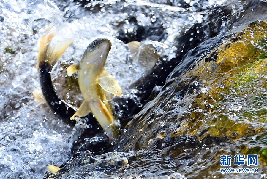 一条湟鱼跃出水面,努力向上游游去(6月23日摄)。