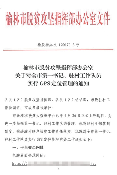 榆林市扶贫办多位工作人员证实,近日,一份署名为“榆林市脱贫攻坚指挥部办公室”的文件下发。文件内容为“对全市第一书记、驻村工作队员实行GPS定位管理”,其中提到,将规范驻村干部签到制度,推进驻村联户扶贫工作责任落实。