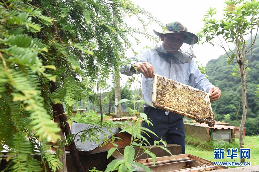 福建武平县脱贫示范户王瑞保利用良好的森林生态系统在梁野仙蜜养蜂基地饲养蜜蜂(6月14日摄)。新华社记者 林善传 摄