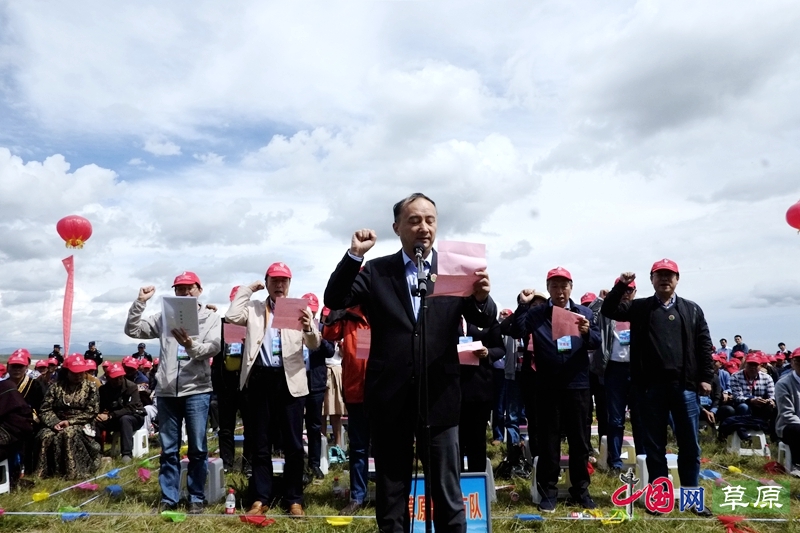 农业部草原监理中心主任李伟方带领参加农业部主办的“大美草原守护行动”的全国草原监理执法人员代表集体宣誓(摄影:中国网记者王金梅)