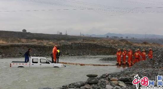 当时下着大雨,消防官兵驾车行驶了近三十公里,由于路况较差,他们几经周折才到达事故现场。一辆皮卡车被湍急的洪水困在河中央,车顶上站着3名被困人员。情况十分紧急。随着河流水位不断上涨,车随时都有被河水冲走的危险,3名被困人员的生命也正遭受着巨大的威胁。加之河道刚被河水冲刷,岸边砂石较多,水流湍急,给救援带来了极大困难。