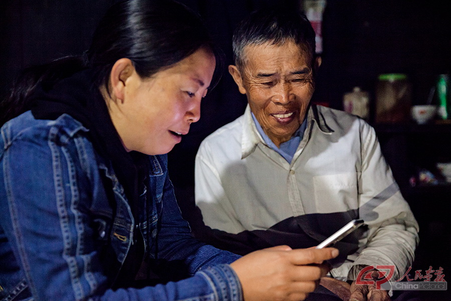 驻村工作组成员左亚丽(左),是来自丹寨县审计局的驻村干部。她常常与姜海泉一起走访。在村民杨光清家,她夸赞杨光清的勤快与能干。而同时,左亚丽与姜海泉正全力帮其寻找失散多年的儿子。 摄影 王蕴聪/ 人民画报