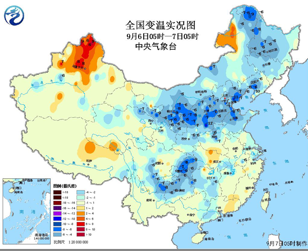 中国网9月7日讯 即日起,全国将迎来入秋后第一波大幅降温。据中央气象台监测,北方多地今日出现4~8℃降温,局地降幅超10℃。
