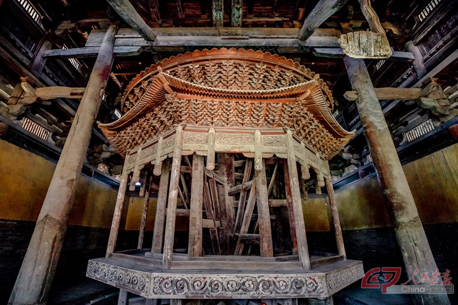 建造于北宋的木制转轮藏,是一个能够转动的大书架,直径7米,整体分为藏座、藏身、藏顶三部分,中间设一根10.8米的木轴上下贯穿。 摄影 郭莎莎/人民画报