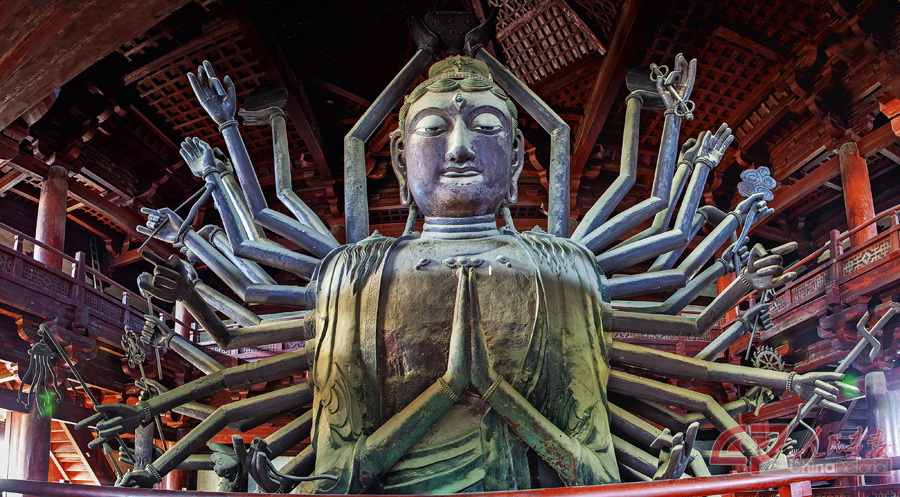 大悲阁内所供的铜铸观音像。大悲阁是隆兴寺的主体建筑,铸造于北宋开宝四年(公元971年)。观音像高21.3米,共42臂,是中国乃至世界上古代铜铸佛像中最高大者。 摄影 武志伟