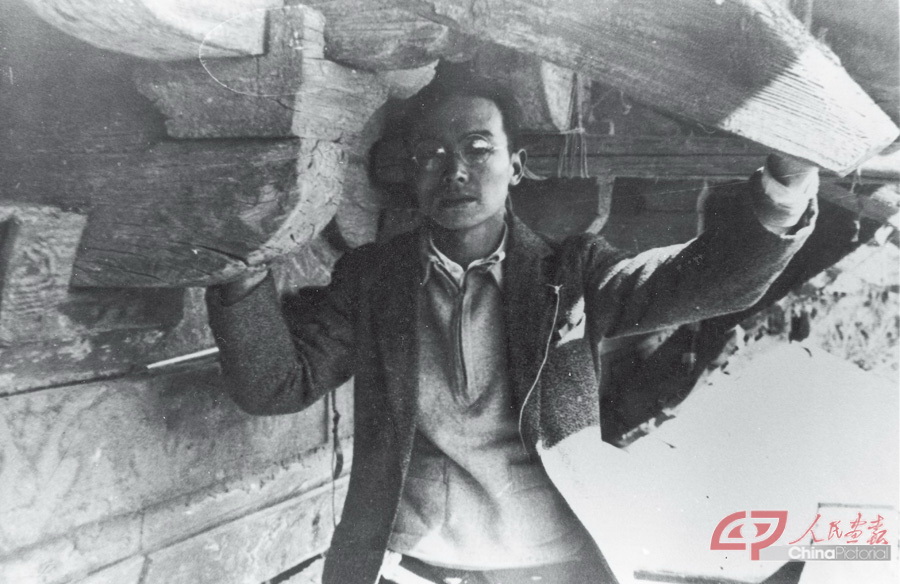 梁思成在转轮藏阁檐下测绘。