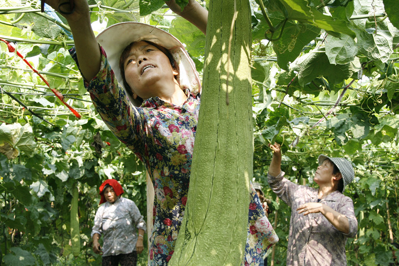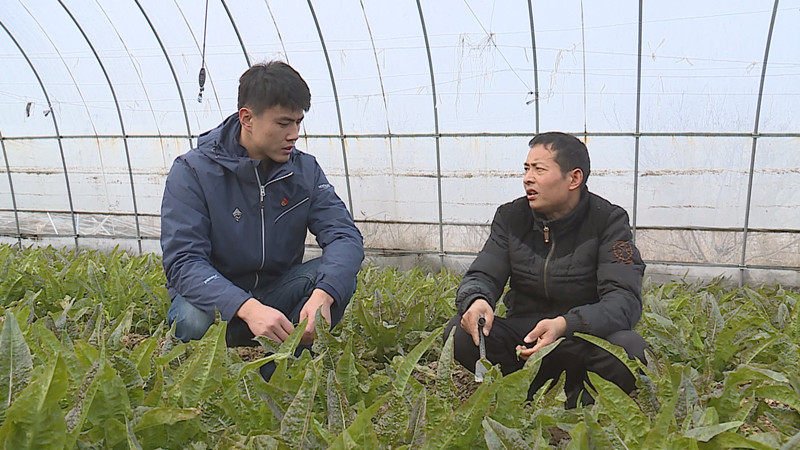 蒙城县双涧镇东岳村蔬菜大棚里,扶贫工作队长朱峰向贫困户郁建红了解蔬菜种植情况