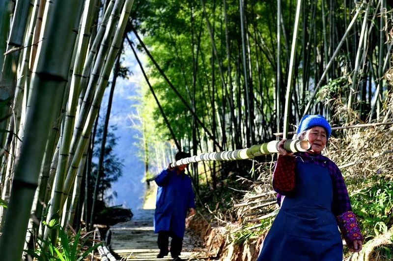 塔水村67岁的彭连武和72岁的老伴杨兴梅把刚砍下的竹子扛回家,他们的两个女儿都在浙江打工。