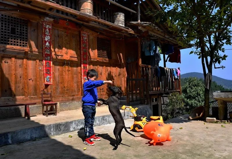 金竹林村5岁的田浩阳在玩耍,家里的老宅经过父亲翻新后,成了村里为数不多的新房。在外经商的父亲经常为孩子买新衣服和玩具。