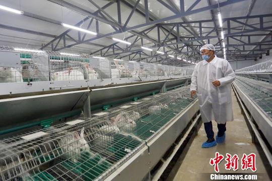 甘肃庆阳市镇原县平泉镇种兔繁育基地内,山东的小伙子朱纪军正在查看兔子生长情况。 高展 摄