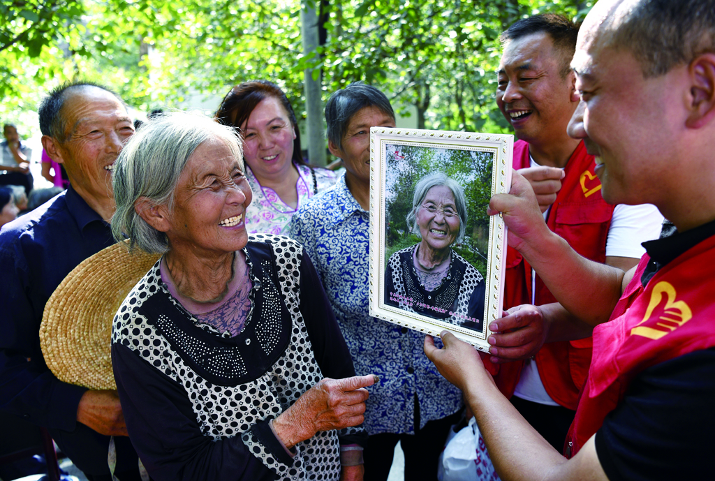 图为2018年8月30日,陕西省洛南县义工联合会的义工罗刚(右一)在四皓街道办马河村为村里的老人李春娃(左二)拍摄个人照片,并将照片装框送给她。