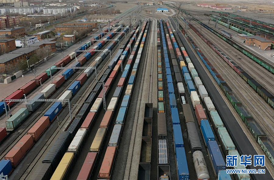 这是4月11日在阿拉山口口岸铁路到发线拍摄的准备出口的货物(无人机照片)。 新华社记者 沙达提 摄