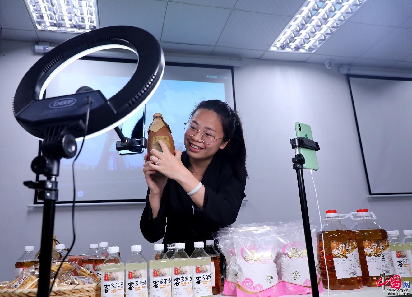 全南县城厢镇干部余梅玉使用网络直播为当地贫困群众销售农产品。