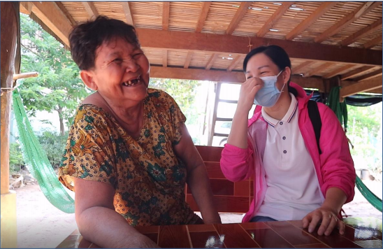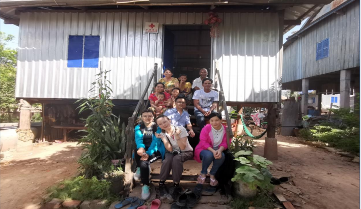 2020 年 6 月 11 日下午,中方专家组成员拜访了村民朋友毛德一家。陈伦奶奶看到专家组的车停在门口,热情地招呼我们进屋。原来要给我们分享好消息呢,陈伦奶奶指着一套新桌椅,笑呵呵地说, “你们看,前几天刚置办的,放在吊脚楼下,我们也想学你们中国人一样坐着凳子聊天”。因为在柬埔寨,当地人平时吃饭和休闲的时间都习惯坐在床上或地上,随处铺张席子就可以玩嗨的节奏。