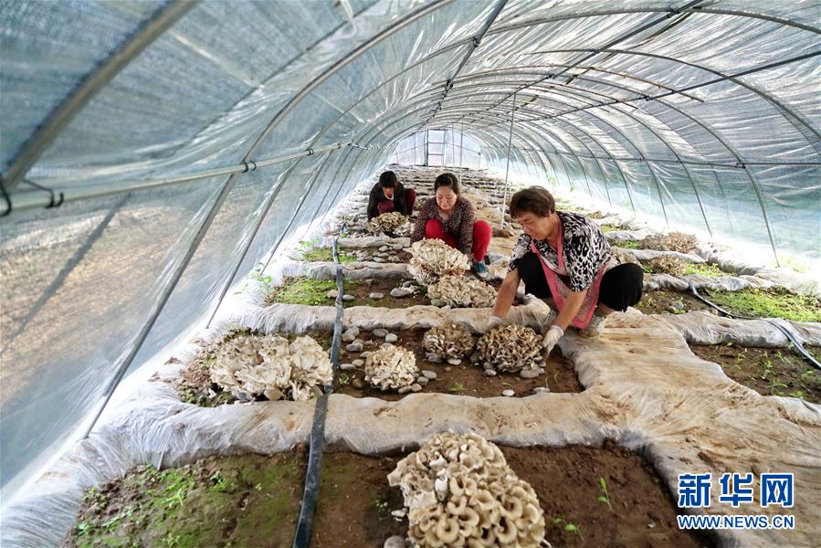 6月19日,农民在迁西县兴城镇盈溢栗蘑种植基地内采收栗蘑。 新华社记者 牟宇 摄