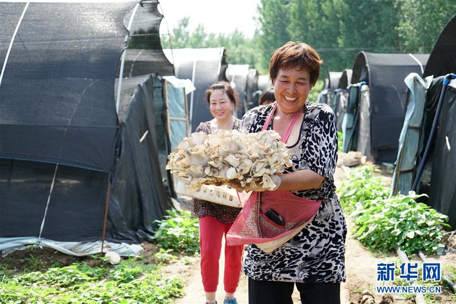 6月19日,农民在迁西县兴城镇盈溢栗蘑种植基地内搬运刚采摘的栗蘑。 新华社记者 牟宇 摄
