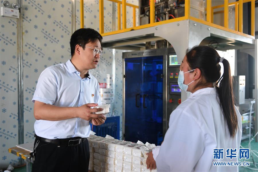 6月28日,张骅(左)在位于远新村的北京林业大学援建扶贫车间的生产车间了解杂粮加工包装情况。 新华社记者 徐钦 摄