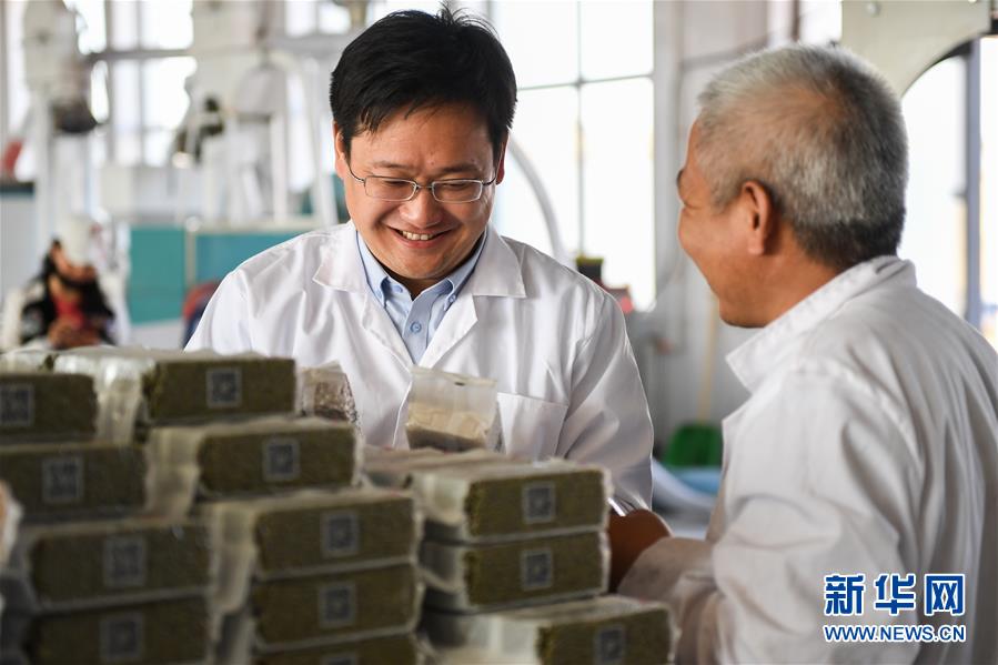 4月30日,张骅(左)在远新种植专业合作社查看杂粮生产包装情况。 新华社记者 刘磊 摄
