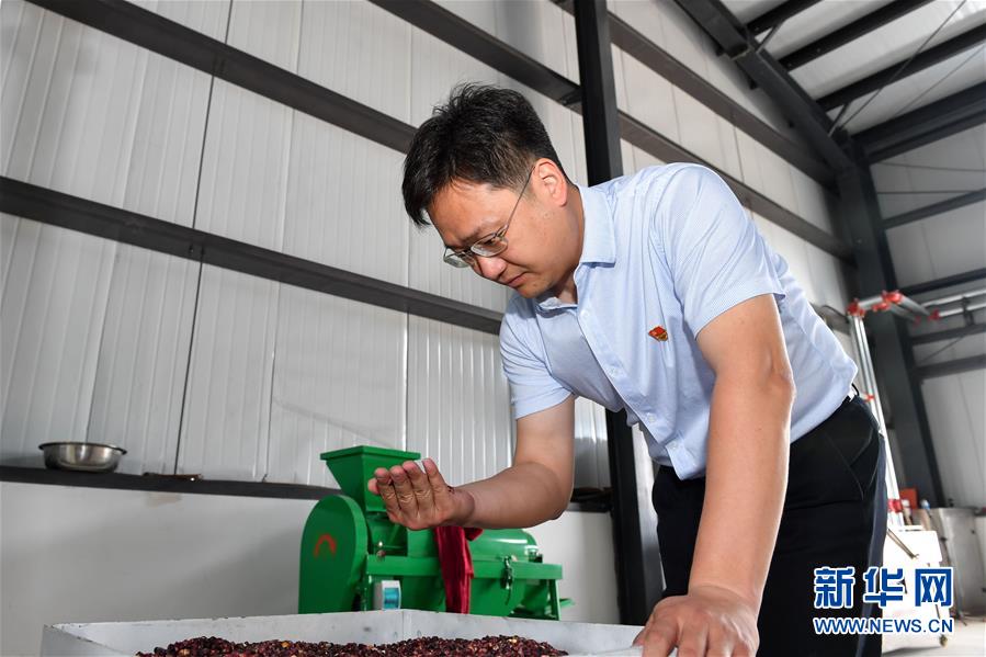 6月29日,张骅在位于远新村的北京林业大学援建扶贫车间内查看黑糯玉米粒。 新华社发(贝赫 摄)