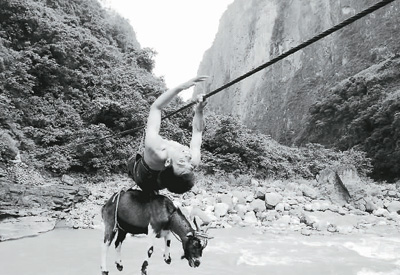 2005年6月5日,且沙次干背羊过溜索。林 强摄(新华社发)