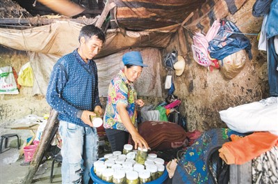 且沙次干、阿达么日杂夫妇在老房子里收拾制作的泡菜。