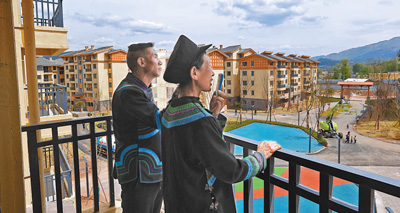 5月13日,某色达体夫妇在昭觉县城易地扶贫搬迁安置点南坪社区新家的阳台给亲戚打电话。新华社记者 江宏景摄