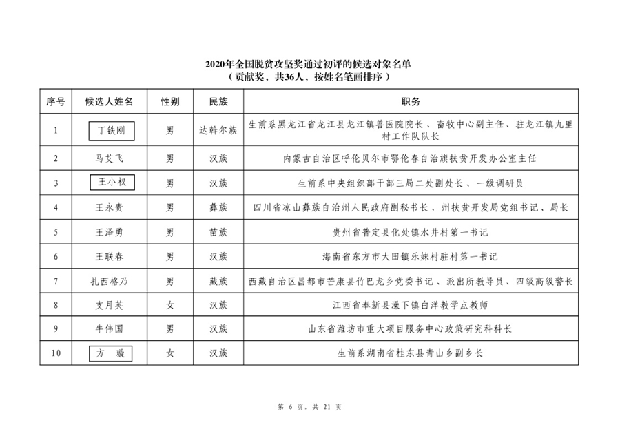 2020年全国脱贫攻坚奖通过初评候选对象公示