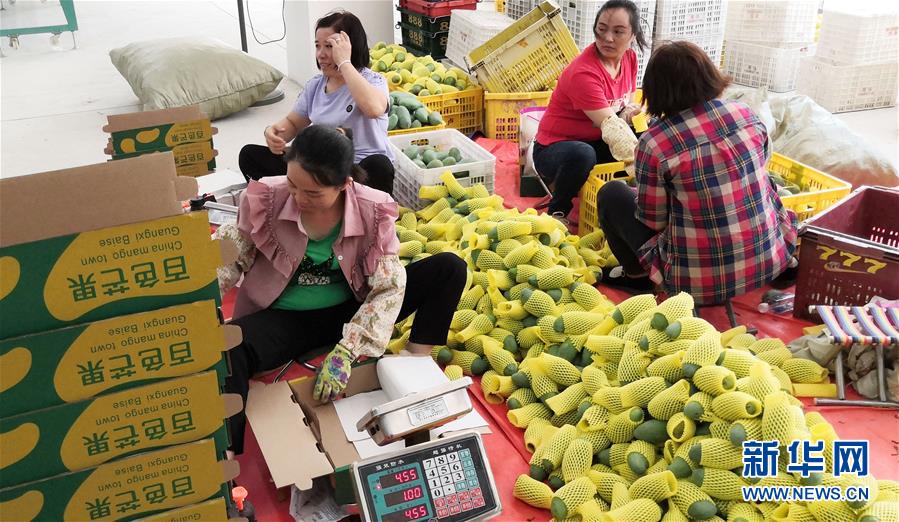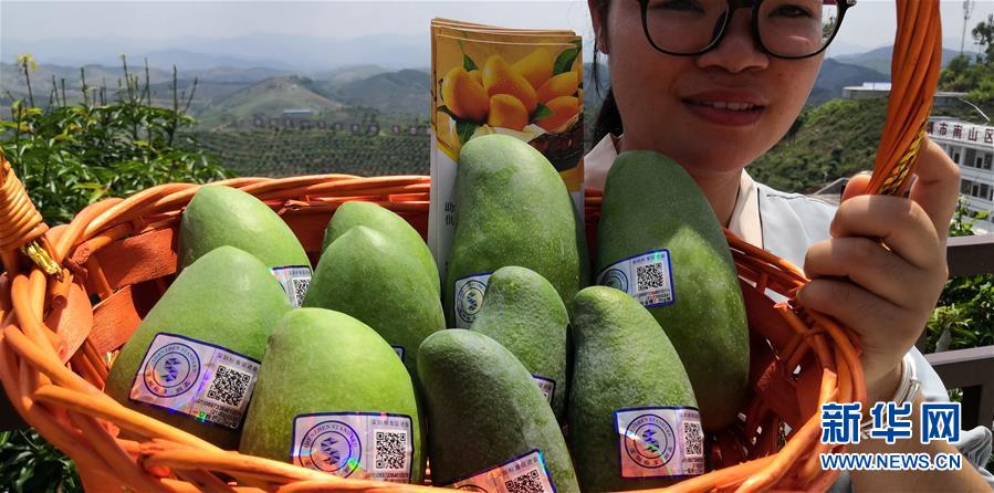 在广西百色市田阳区20万亩农林生态脱贫产业核心示范区,一名工作人员在展示获得“圳品”认证的百色芒果(7月14日摄)。新华社记者 周科 摄