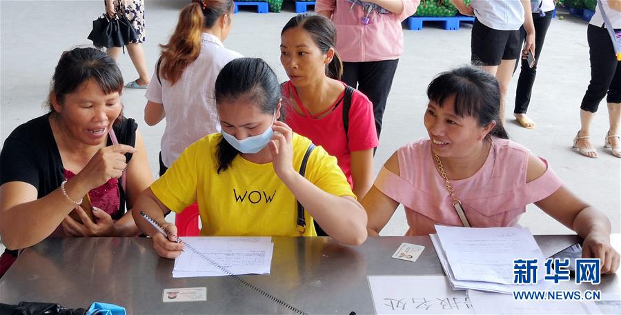 广西百色市田阳区几位妇女在深圳通过粤桂扶贫资金建设的广西果天下食品有限公司应聘(7月14日摄)。新华社记者 周科 摄