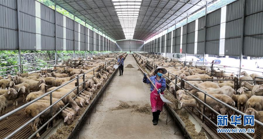 广西河池市大化瑶族自治县雅龙乡红日村贫困户在广东投入帮扶资金建成的粤桂扶贫协作肉羊养殖园劳作(7月9日摄)。新华社记者 周科 摄