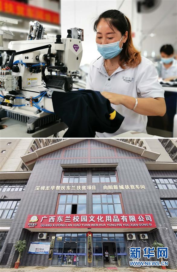 这是拼版图片。上图是向阳新城居民印桂青在广西东兰校园文化用品有限公司上班;下图是广西河池市东兰县扶贫生态移民安置区——向阳新城扶贫车间(7月12日摄)。新华社记者 王丰 摄