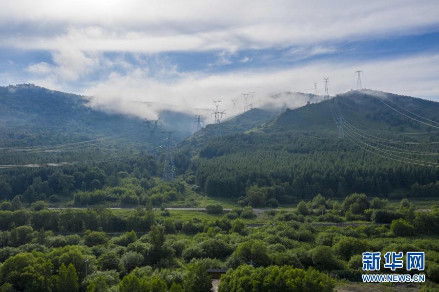 内蒙古阿尔山市五岔沟镇大山深处,输电塔高耸山间(7月4日摄)。 新华社发(毕力格 摄)