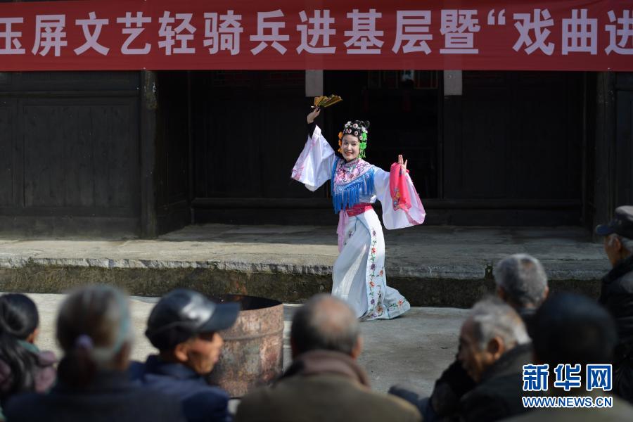 11月30日,在贵州省铜仁市玉屏侗族自治县新店镇新店村农家院坝,文化志愿者为村民表演京剧。
