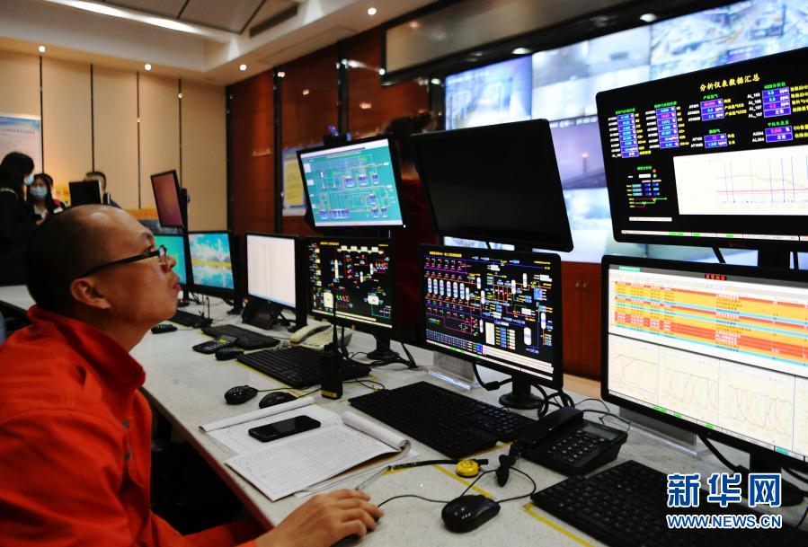 11月30日,在园区下游配套企业福建福源凯美特气体有限公司中央控制室,工作人员监控设备运转。