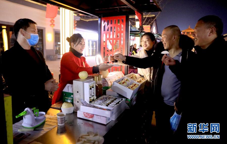 1月4日晚,在四川省华蓥市农产品夜市上,顾客在品尝特色农产品。