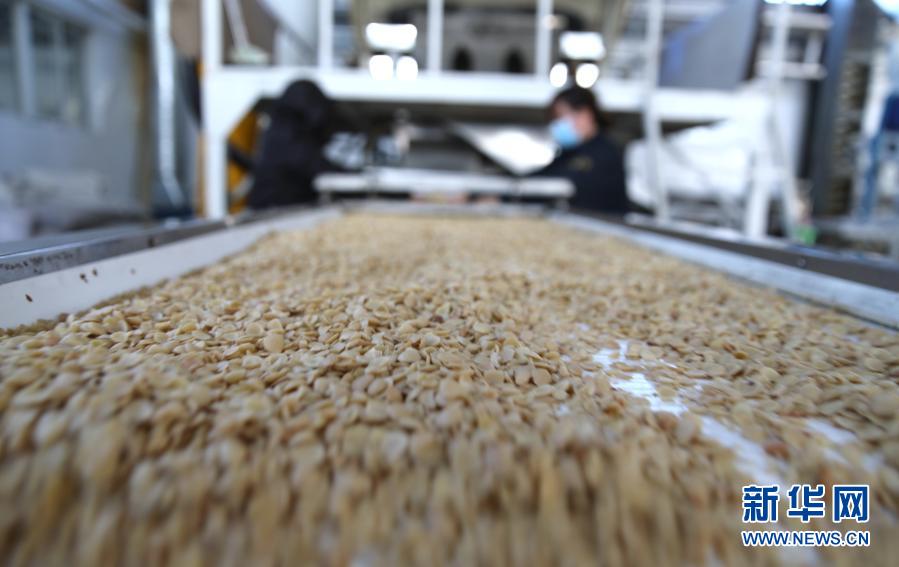 1月5日,在承德县一家杏仁深加工企业,员工在杏仁脱苦车间内忙碌。